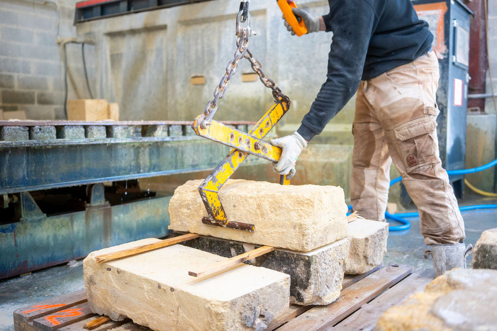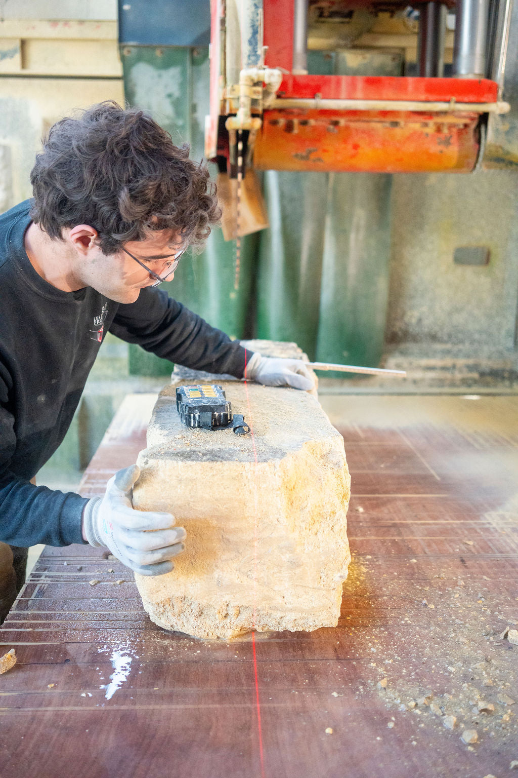 Nos ateliers, implantés sur site, associent taille manuelle et machines de dernière génération (découpe numérique, débitage, façonnage), permettant finesse, précision et adaptation aux chantiers simples comme complexes.